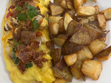 Scrambled with melted cheddar, onions, and bacon over homefries