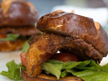 Fried oyster mushroom cutlet with savory seasonings, lettuce, tomato, and honey mustard on a pretzel bun