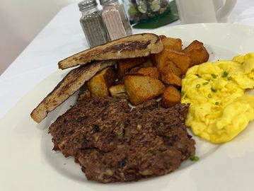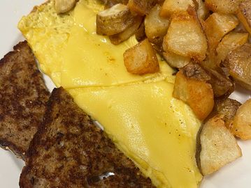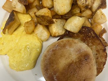 Just egg scramble, choice of bacon, sausage, ham, or veggies, home fries, and toast