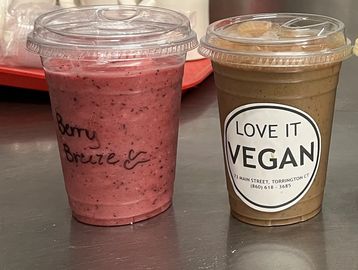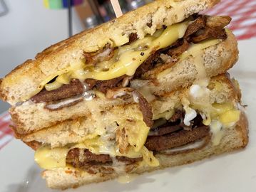 Shaved seitan steak, onions, mushrooms, and cheddar