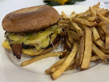 Fried oyster mushrooms with chicken seasoning, ranch, cheddar, bacon, lettuce, and tomato on a pretzel bun (pictured on GF bread)