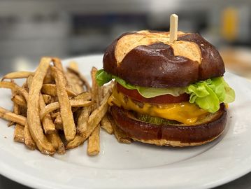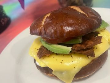 Beyond burger, cheddar cheese, lettuce, tomato, onions, pickles, and mayo on a rpretzel bun