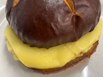 House made seitan steak, onions, peppers, cheddar, mozzarella cheese, and mayo on a pretzel roll