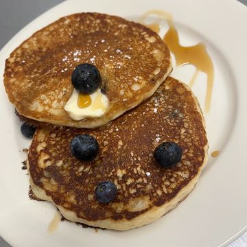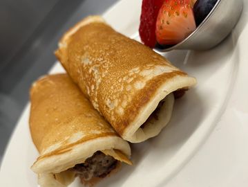 Beyond sausage wrapped in two pancakes with home fries or fruit