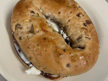 House made seitan steak (pictured on a bagel instead of pretzel bun)