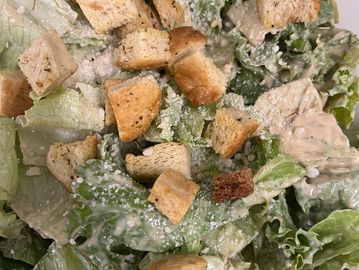 Housemade caesar dressing, lettuce, croutons, and Violife parmesan